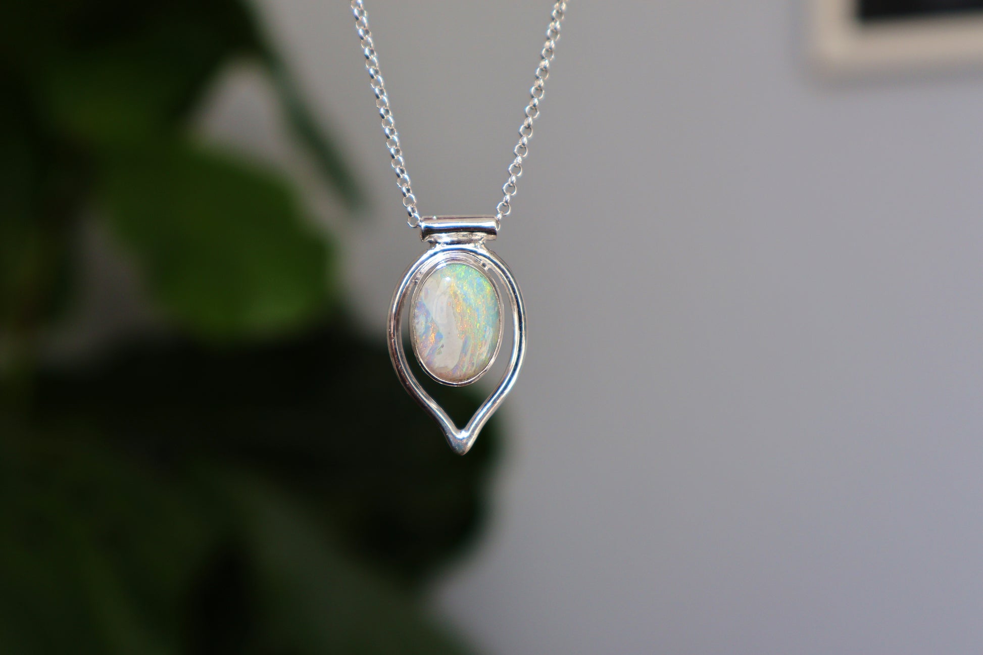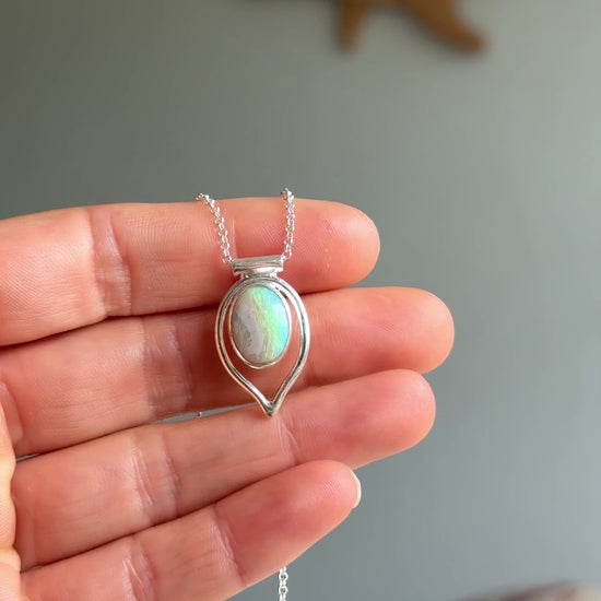 Soft curves and ocean light. Ailu features a solid Lightning Ridge opal with gentle flashes of green, pink, and gold, set in a smooth sterling-silver frame with a teardrop-inspired shape. A simple, elegant design that keeps the focus on the stone’s natural colour play.
