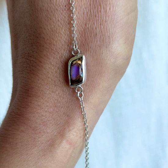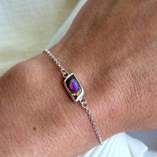 This handcrafted Australian Boulder Opal bracelet is made with solid 925 sterling silver and features a natural rectangular opal with vibrant flashes of purple, red and hints of earthy matrix. Each opal is one-of-a-kind, making this piece a truly unique addition to your jewellery collection.