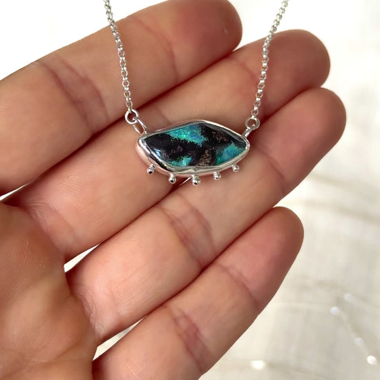 A softly curved boulder opal pendant that glows with deep blue and green reflections, framed in smooth sterling silver. Small silver accents rest beneath the stone, adding gentle texture and movement that mirror drops of ocean mist.