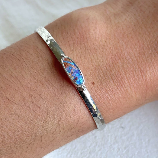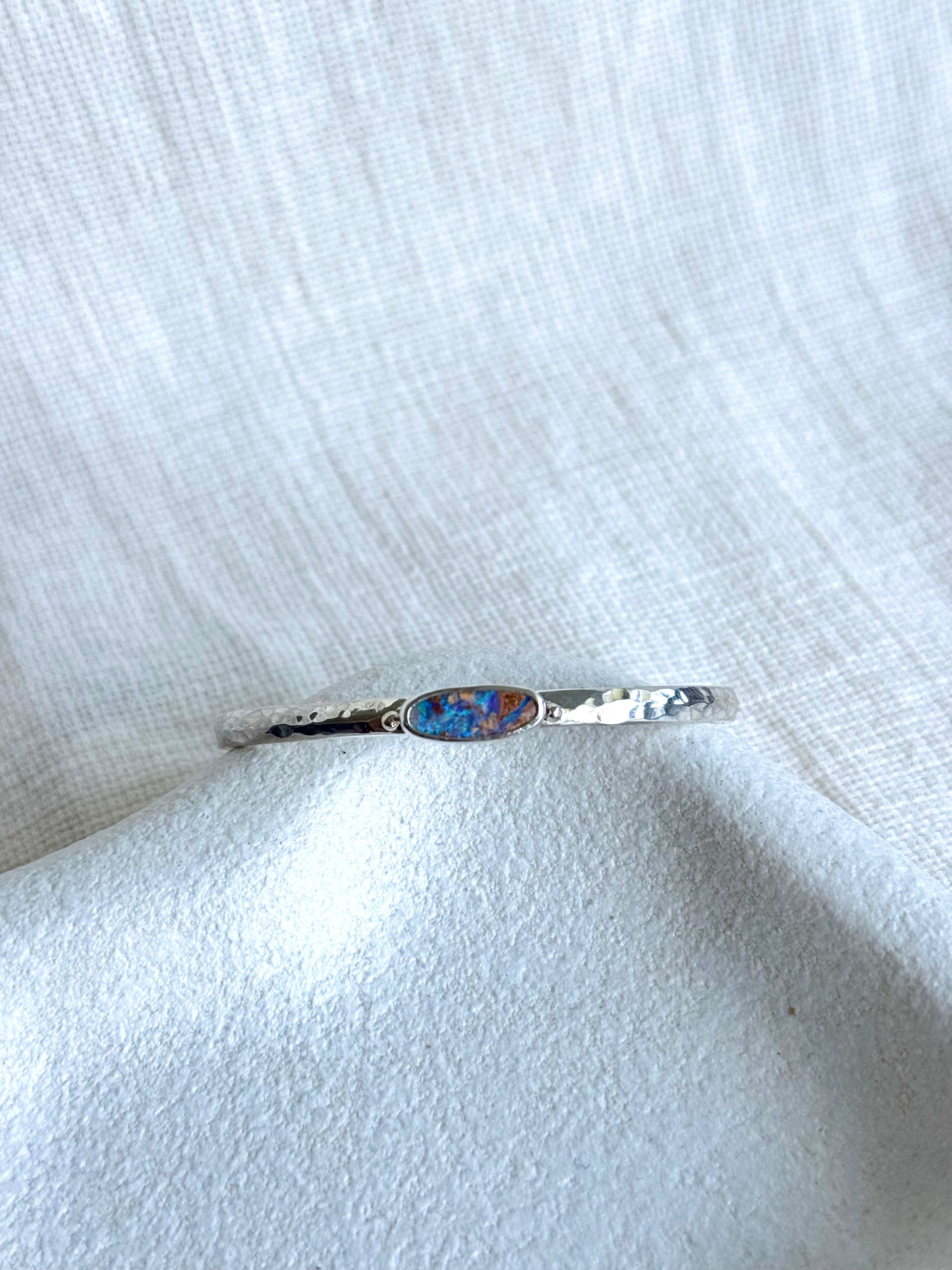 Handcrafted in Sydney, this cuff bracelet features a genuine Australian opal set in solid 925 sterling silver. The natural opal flashes with unique colours, making each piece truly one-of-a-kind. Designed with a comfortable open cuff fit and subtle hammered silver texture, it’s perfect for everyday wear or special occasions.