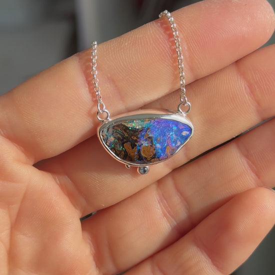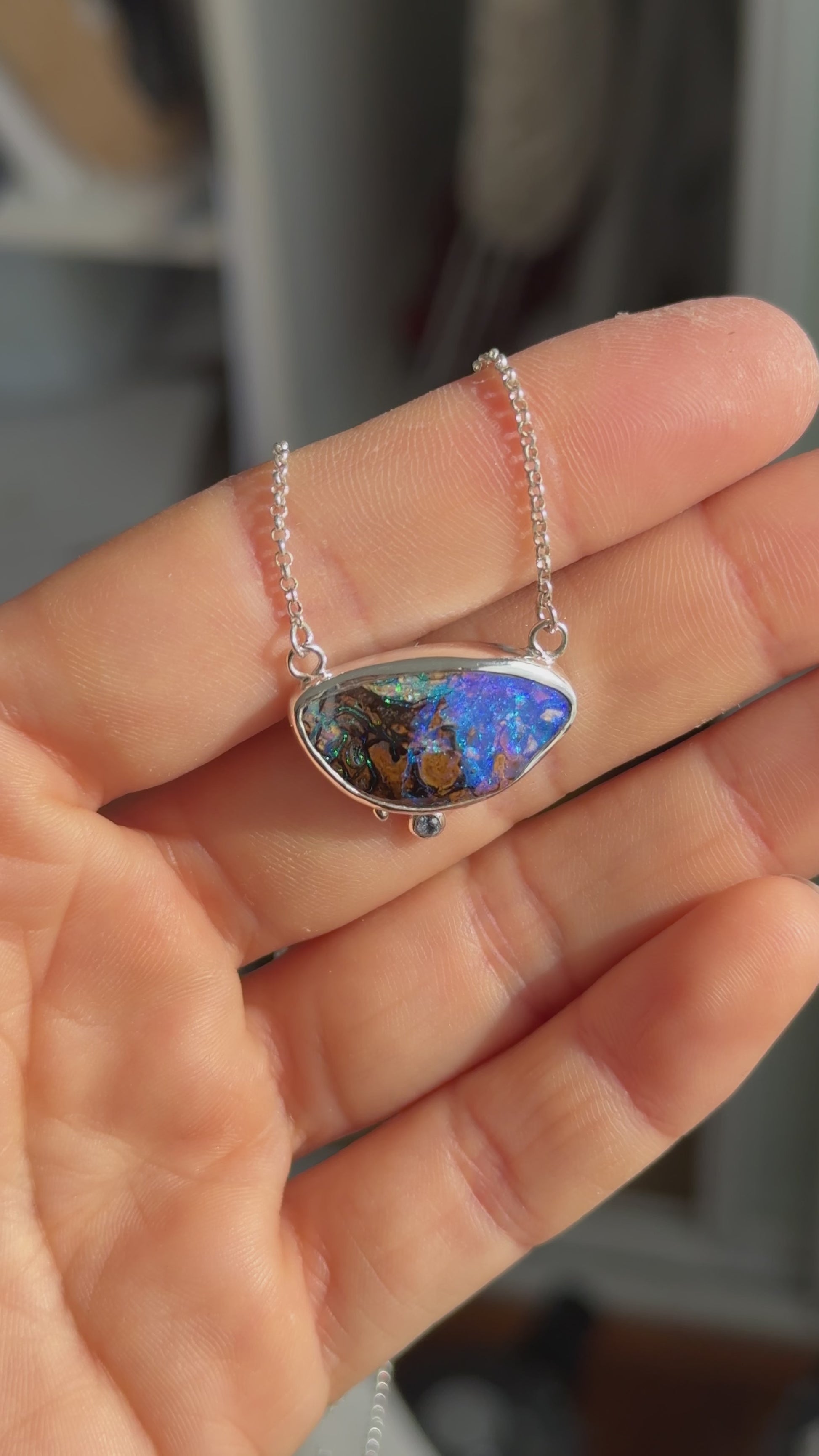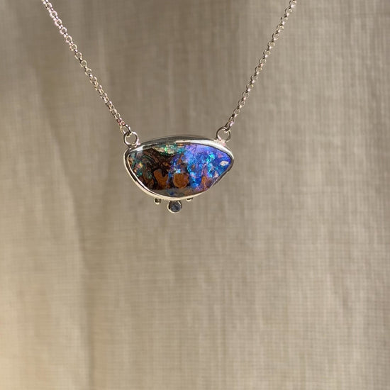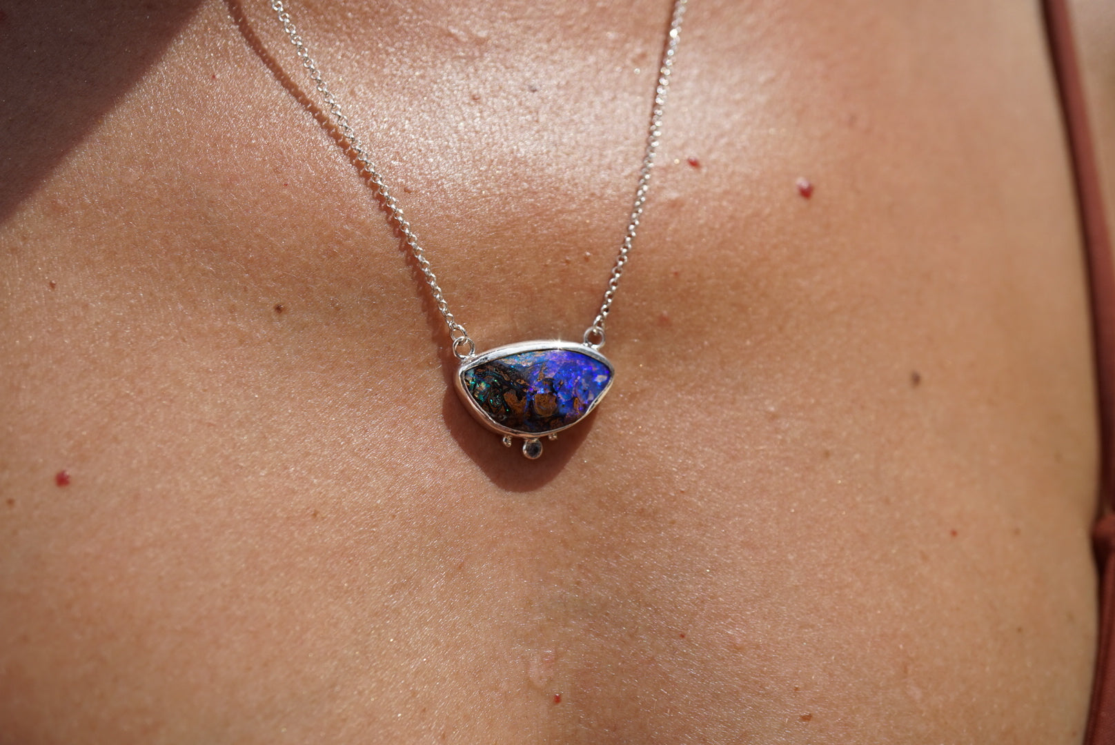 Part of the Blue Echo collection, the Cenit Boulder Necklace brings together the deep, shifting blues of Australian opal with a subtle touch of sparkle from a faceted blue topaz. The natural boulder patterns contrast beautifully with the silver setting, creating a piece that feels both grounded and luminous.