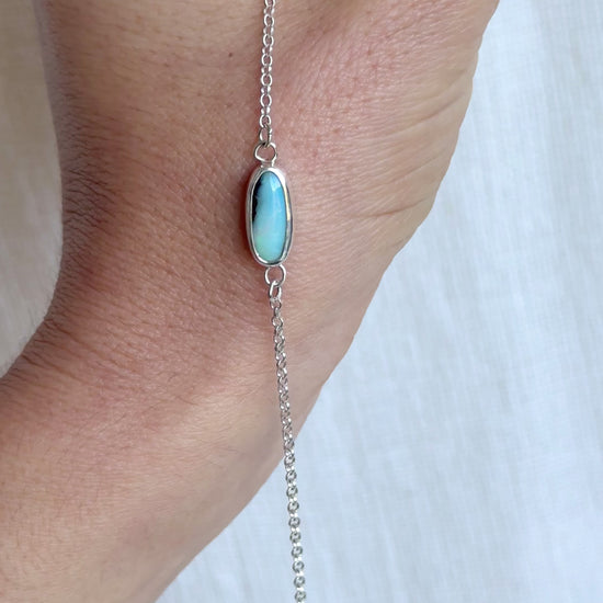 This elegant Australian opal bracelet is handcrafted in solid 925 sterling silver, featuring a natural oval opal with dreamy aqua and light blue tones. Its fine silver chain makes it a versatile piece of artisan jewellery, perfect for everyday wear or layering with other favourites.
