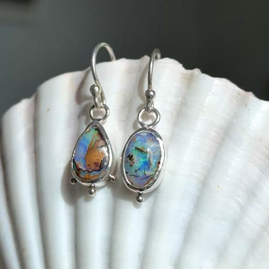 These handcrafted sterling silver earrings feature natural Australian Boulder opals, known for their unique mix of earthy ironstone and vibrant flashes of blue, green and purple. Each pair is one of a kind, with opals carefully selected for their striking patterns that reflect both the land and the sea. Lightweight and timeless, these drop earrings are perfect for everyday wear or as a statement piece for special occasions.
