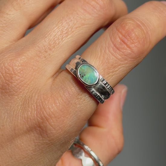 A simple yet bold design featuring a solid Australian opal set in sterling silver. The band has a softly double textured finish that gives it an organic, handcrafted feel, like ripples in sand.