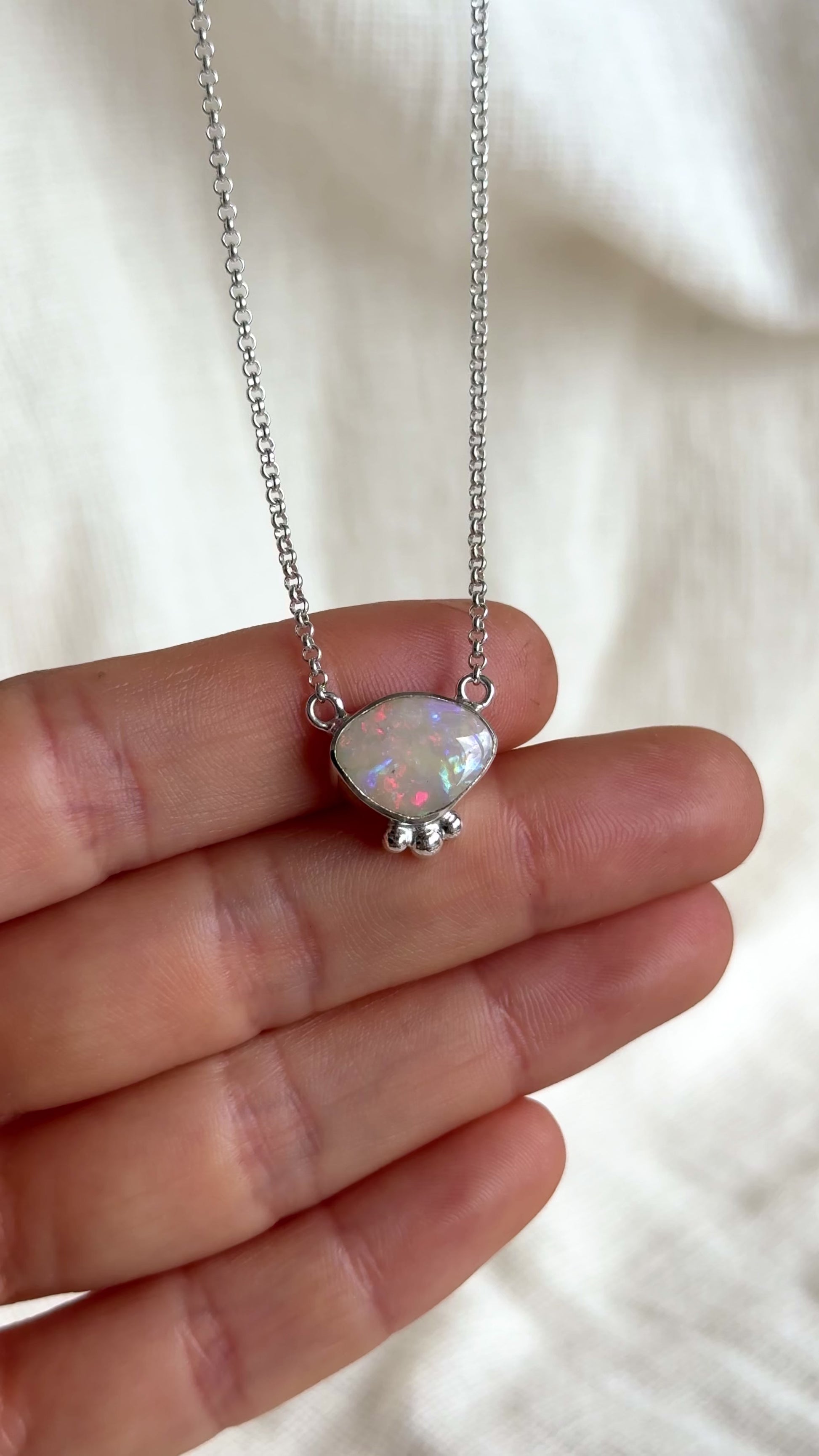 Soft, radiant and full of quiet light. Hina features a solid Lightning Ridge opal with gentle pastel flashes—pinks, greens and soft blues—that shift beautifully under sunlight. Set in smooth sterling silver and finished with three small granules beneath the stone, this necklace feels delicate yet full of character.