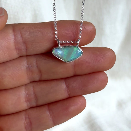 Hoku features a solid Lightning Ridge opal with soft green–blue flashes, set low in a smooth sterling-silver bezel and suspended from twin bails with a tiny chain bridge for a airy, modern look. One of a kind.