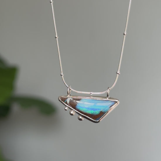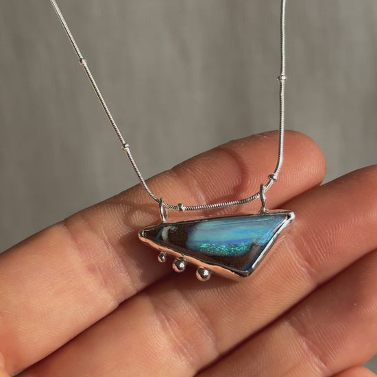 This pendant features a striking boulder opal, bands of deep blue and turquoise flowing through earthy tones. Its minimalist silver frame highlights the stone’s natural beauty, creating a balanced, timeless design.