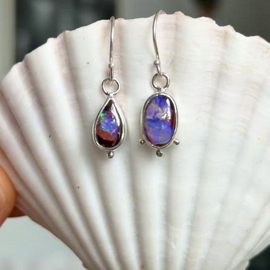 These handcrafted sterling silver earrings showcase natural Australian Boulder opals with rich tones of deep purple, blue, and flashes of green. Each stone is unique, combining earthy ironstone with brilliant colour play that shifts in the light like a midnight sky. Designed to be lightweight yet striking, the Indigo Earrings are perfect for adding a touch of timeless elegance to your everyday style or as a standout piece for special occasions.