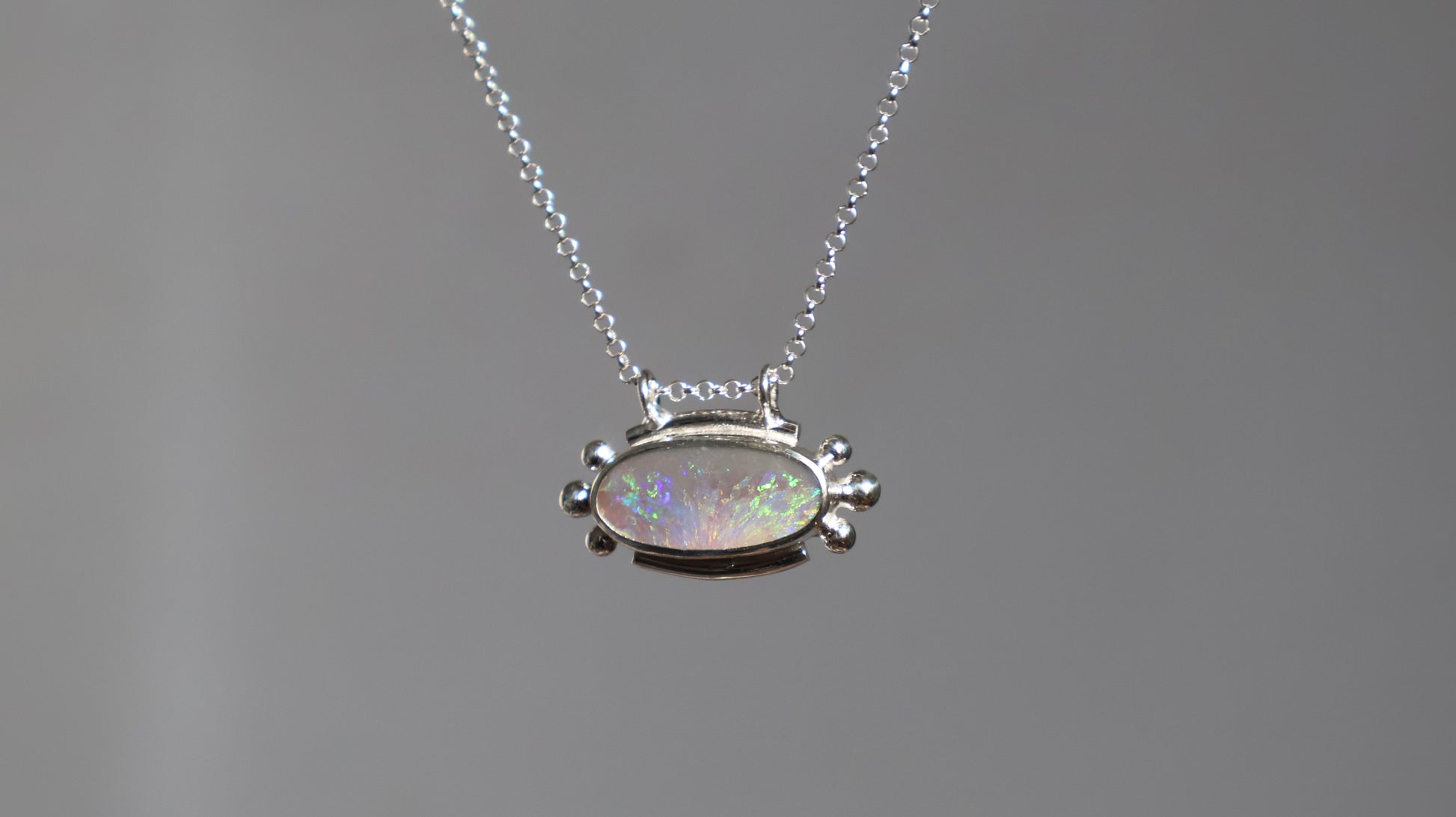 Soft light and subtle texture. Inna features an oval Lightning Ridge opal with pastel flashes of green, pink, and lilac, held in a sterling-silver setting detailed with small silver dots on each side. A simple, balanced design that highlights the stone’s natural shimmer.
