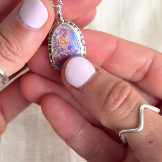 This striking Boulder Opal reveals vibrant blues, purples, and earthy copper tones — reminiscent of jacaranda blooms against an Australian sky. Set in a handcrafted silver frame with fine linear detailing, it’s a timeless statement piece inspired by nature’s colour harmony.