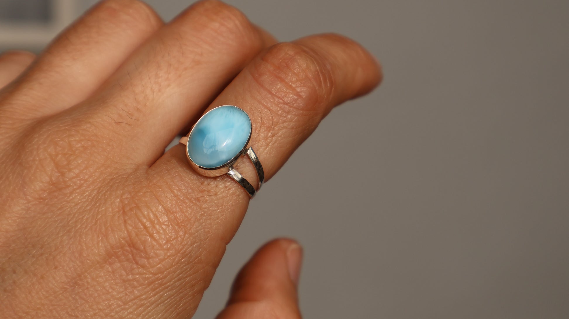 Larimar is often associated with calm and balance, making this ring a meaningful choice for anyone who wants a reminder to slow down and stay grounded.