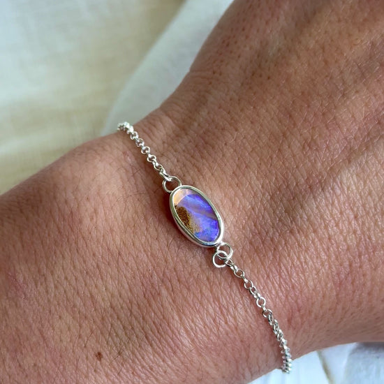 This handcrafted Australian opal bracelet is made in solid 925 sterling silver, featuring a natural oval opal with rich purple and golden matrix tones. Each stone is completely unique, making your bracelet a true one-of-a-kind piece of artisan jewellery.