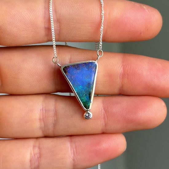 A captivating pendant showcasing a solid boulder opal framed in sterling silver, with tones that shift between ocean blue and stormy indigo. A delicate iolite gemstone sits just below, adding a soft purple shimmer that complements the opal’s natural play of colour.