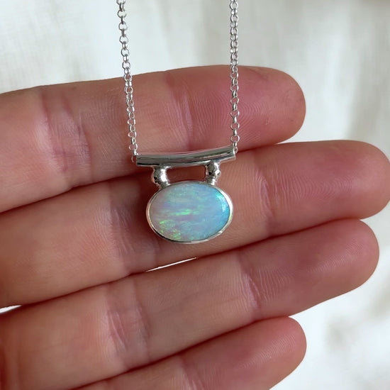 Calm and luminous like sea light at dawn, Makani carries a soft yet striking presence. This piece features a solid Lightning Ridge opal with gentle pastel flashes—greens, blues, and hints of pink—set in a clean oval bezel beneath a curved silver bar. Its minimal lines and balanced shape give it a timeless, ocean-inspired feel.
