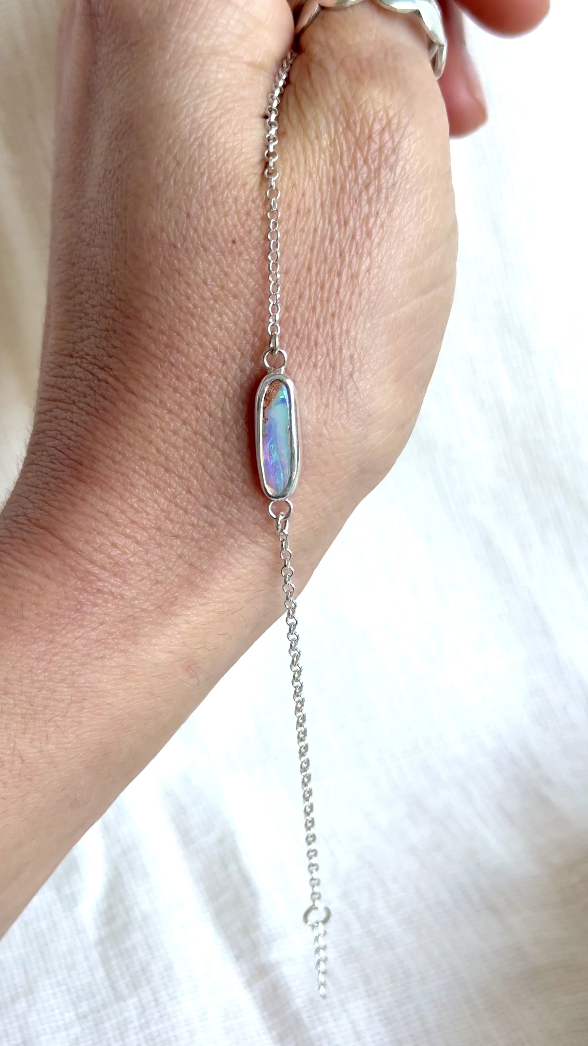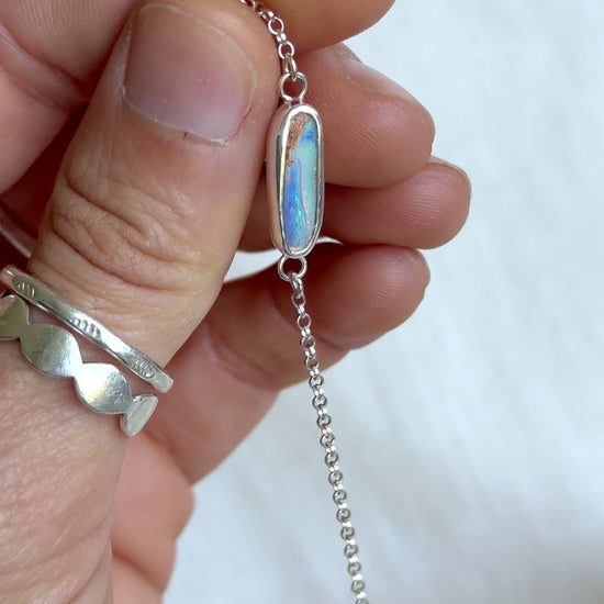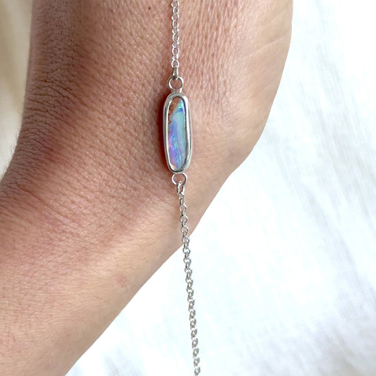 This handcrafted Australian opal bracelet is set in solid 925 sterling silver, featuring a vibrant oval opal with flashes of blue and purple. The minimalist chain bracelet design makes it easy to wear daily, while the opal’s natural play of colour adds a unique ocean-inspired touch.