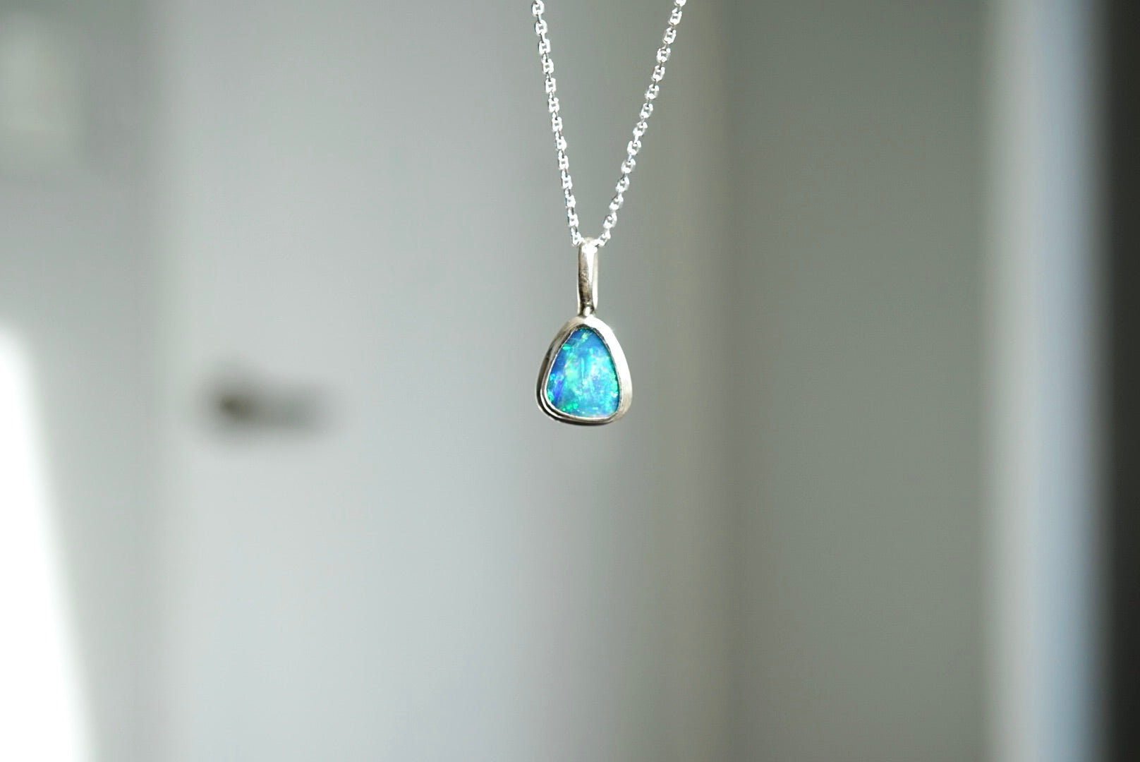 A minimal pendant featuring a bright Australian opal set in sterling silver. Its organic triangle shape and soft hues of blue and green make it an easy, everyday piece that still feels special.