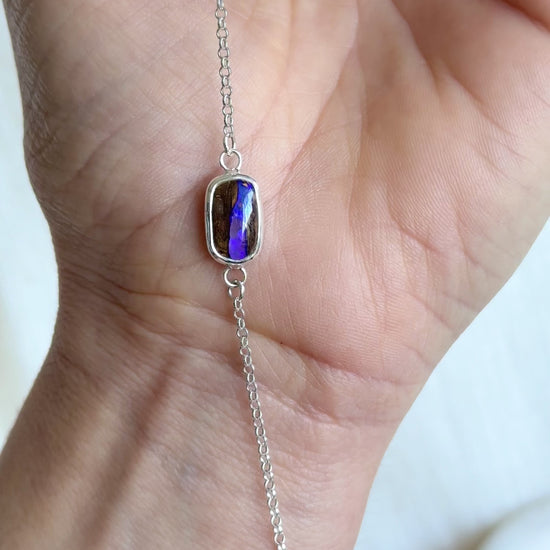 This striking Australian boulder opal bracelet is handcrafted in solid 925 sterling silver, showcasing a natural rectangular opal with deep purple and electric blue flashes against an earthy matrix background. Each stone is completely unique, making your bracelet one of a kind.