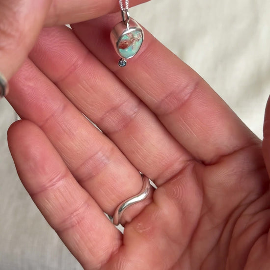 A delicate Boulder Opal pendant shimmering with ocean blues and soft copper hues, finished with a light blue topaz drop that adds a touch of clarity and movement. Inspired by early morning light reflecting on calm water — peaceful, fresh, and full of life.