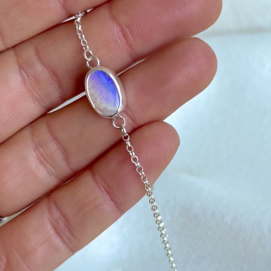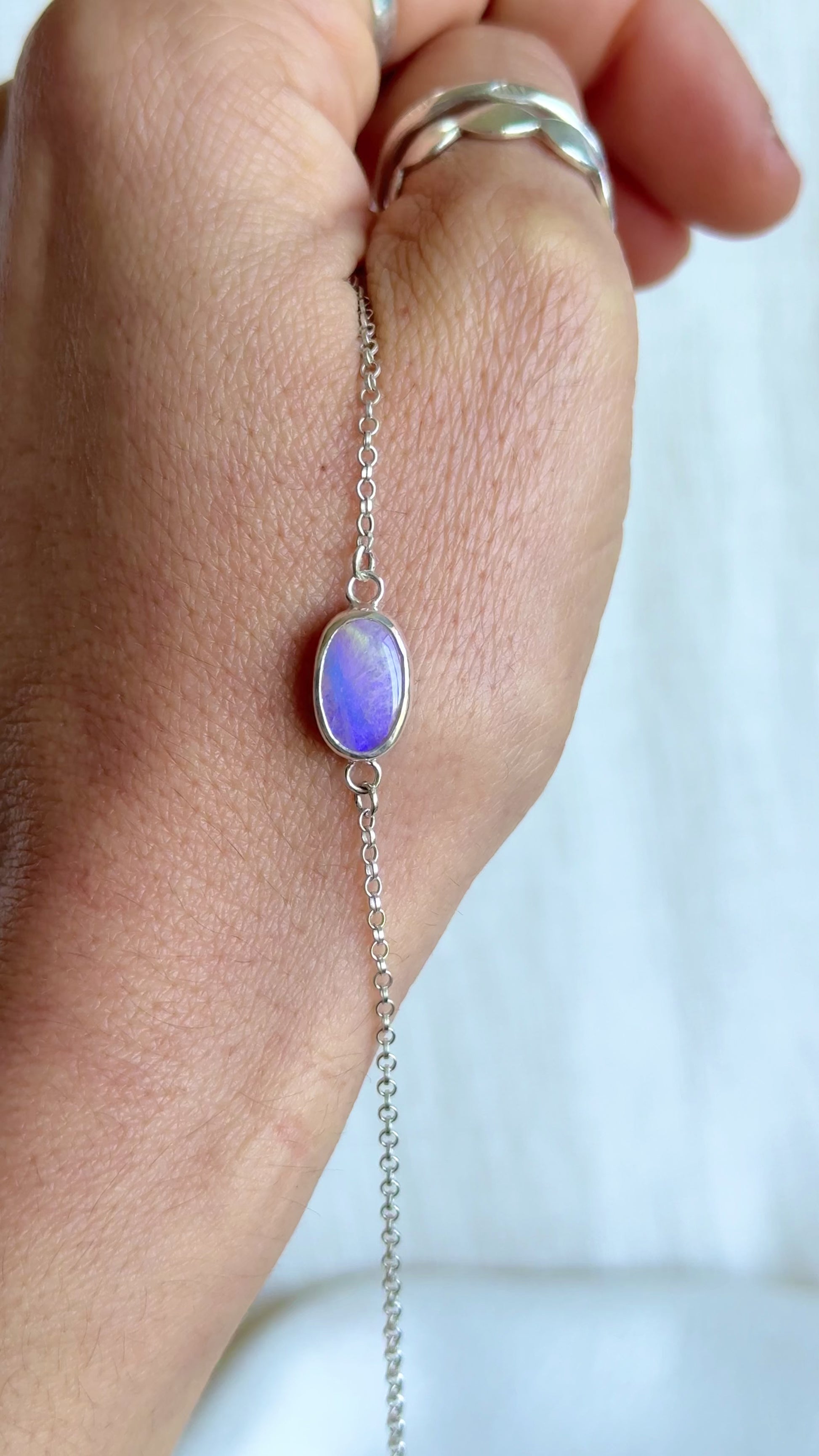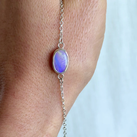 This elegant Australian opal bracelet is handcrafted in solid 925 sterling silver, featuring a natural oval opal with soft lilac and blue hues that shimmer beautifully in the light. Each opal is unique, making your bracelet a one-of-a-kind piece of artisan jewellery.
