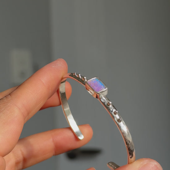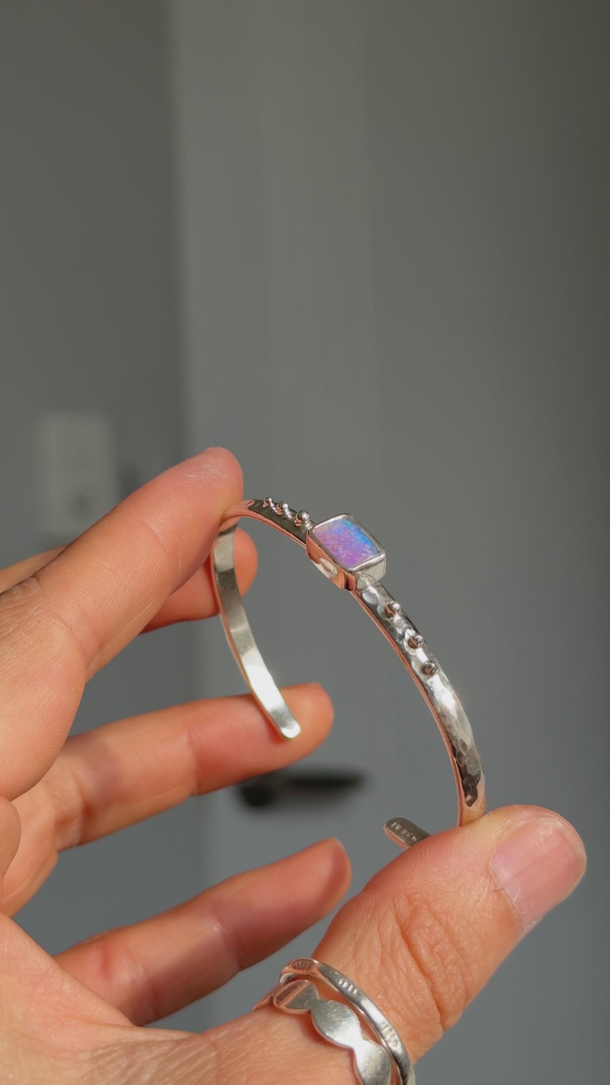 A handcrafted sterling silver cuff featuring a Pipe opal, glowing with shifting tones of lilac, sky blue and soft aqua. The band has a lightly hammered texture, adding a natural, tactile feel that contrasts beautifully with the opal’s smooth, glassy finish.