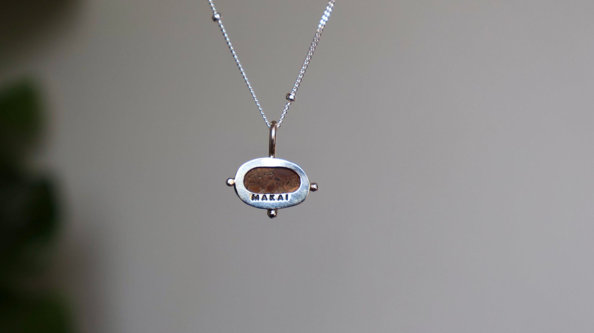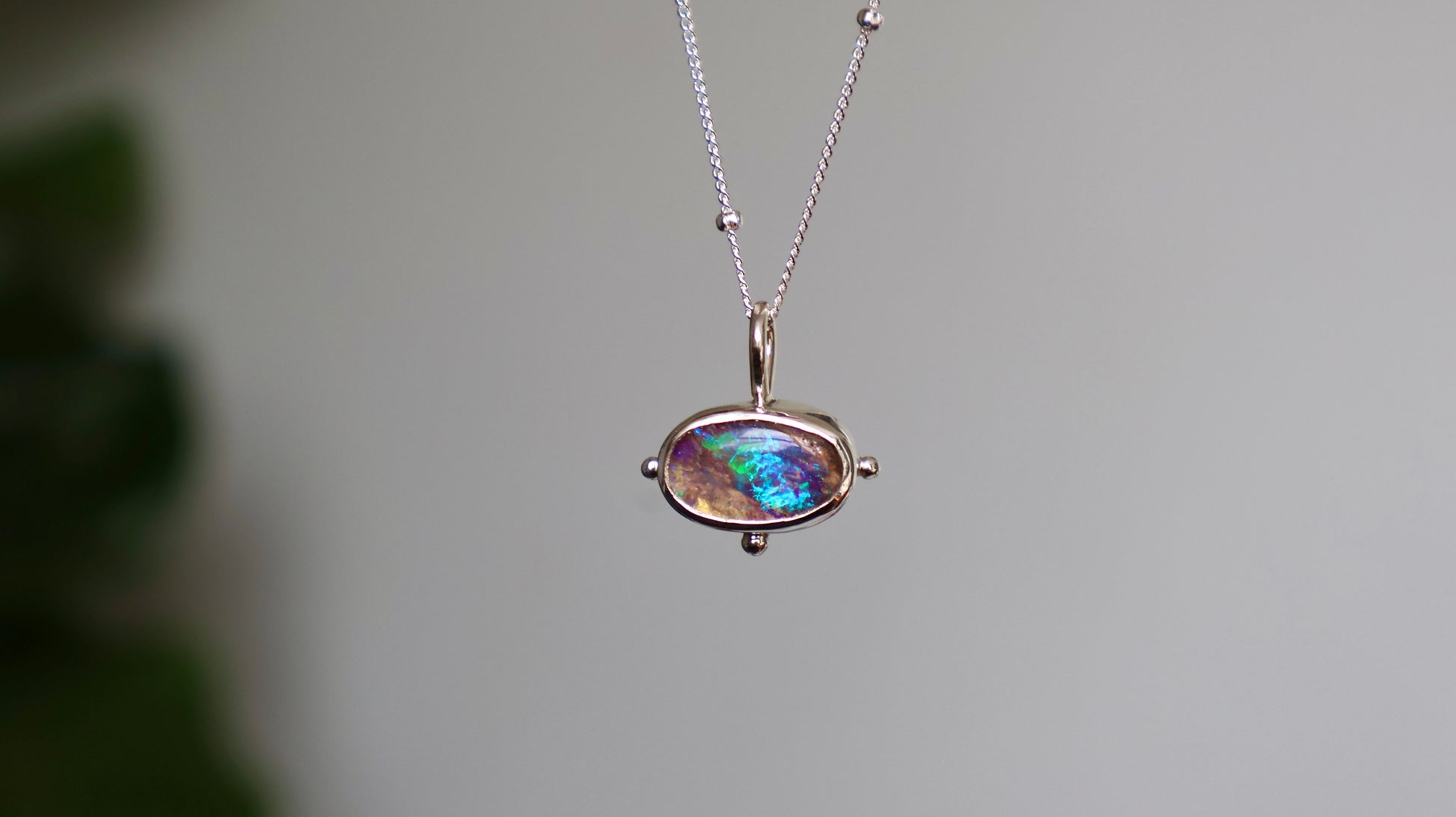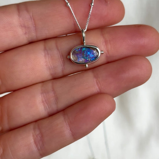 An oval Boulder Opal with deep ocean blues and flashes of green, framed in a simple silver bezel with delicate dot details. Its colours shift with the light, echoing the rhythm of waves and the quiet beauty of the sea.
