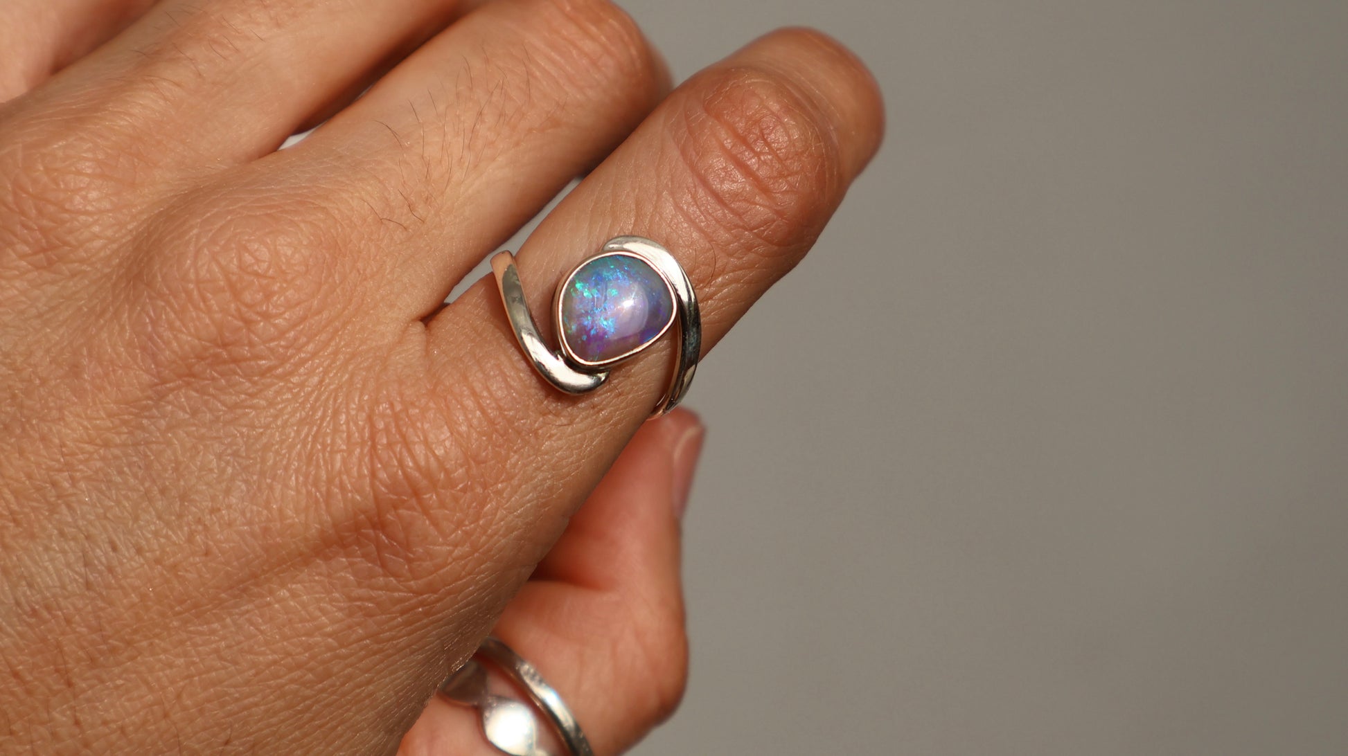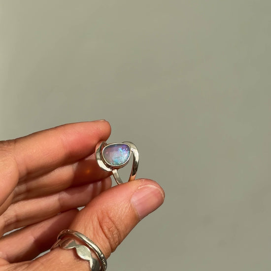 A flowing silver band wraps around a luminous oval stone, catching the light from every angle. Sari is elegant and sculptural, designed to move with the natural curve of your hand — simple yet full of presence.