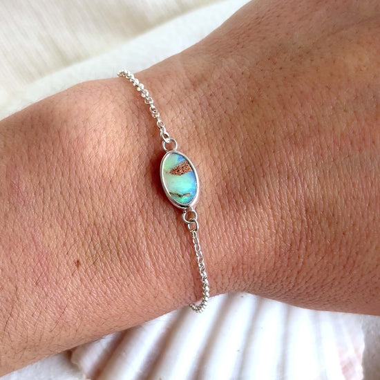 This elegant Australian opal bracelet is handcrafted in solid 925 sterling silver, featuring a natural oval opal with striking turquoise, aqua, and earthy tones. Its fine sterling silver chain design makes it lightweight and perfect for everyday wear, while the opal’s unique colours reflect the beauty of the ocean and Australian landscape.
