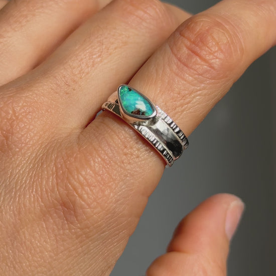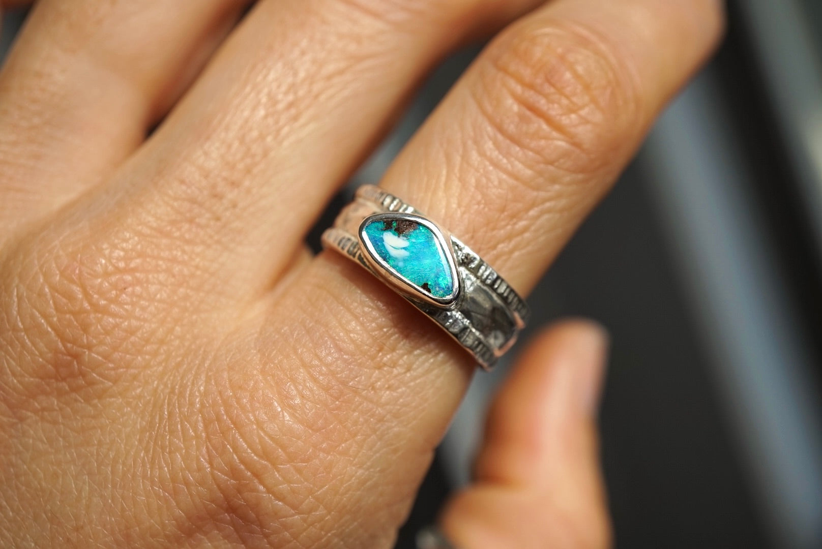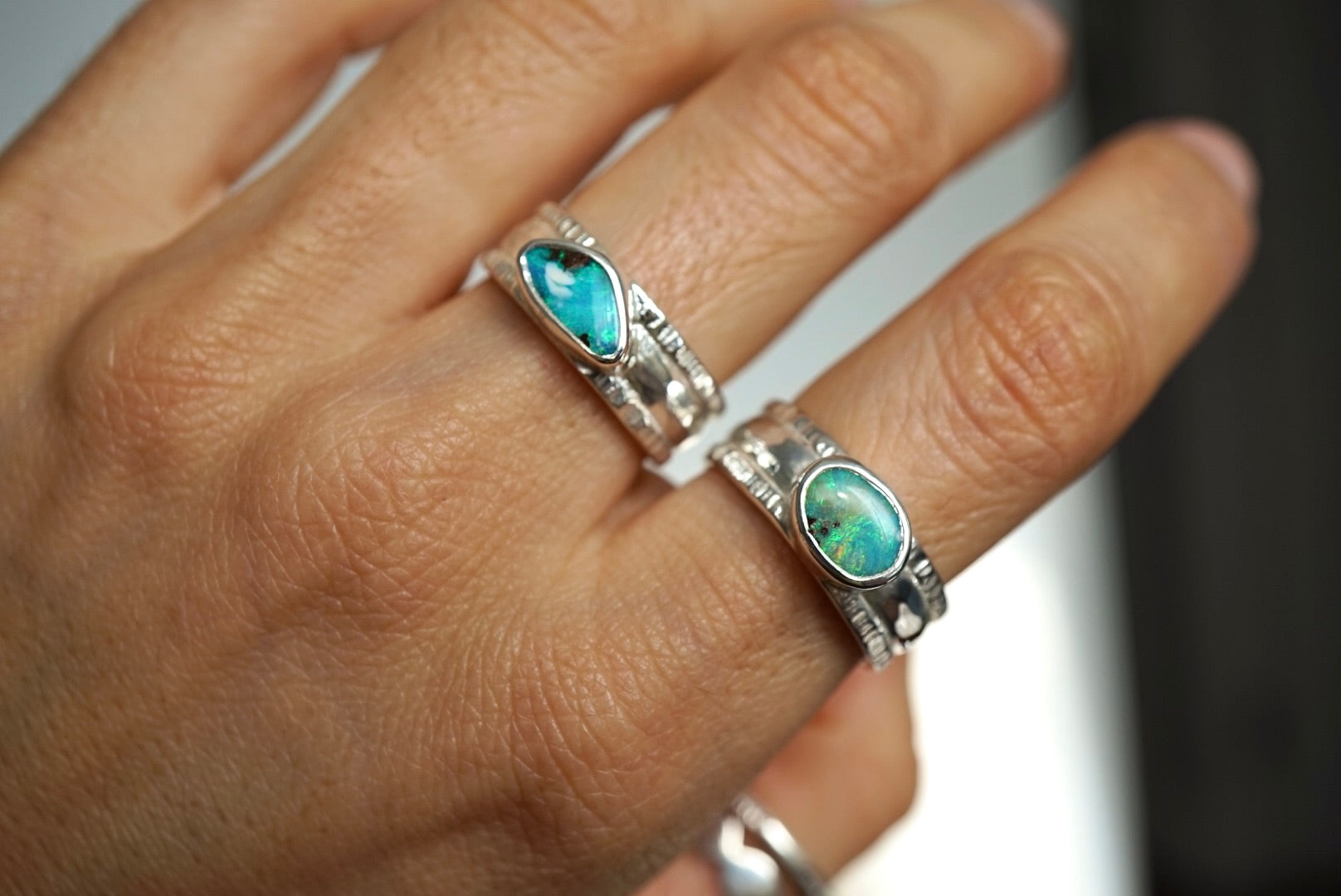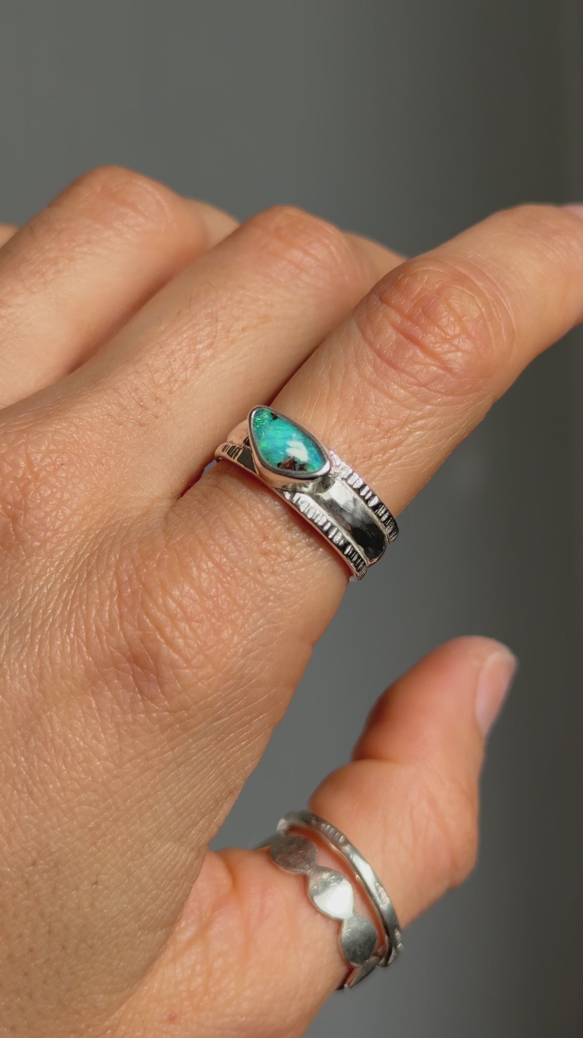 A one-of-a-kind ring featuring a vibrant Australian opal set in textured sterling silver. The mix of smooth and hammered finishes gives it an organic, coastal feel, like waves meeting the shore.