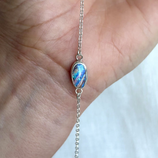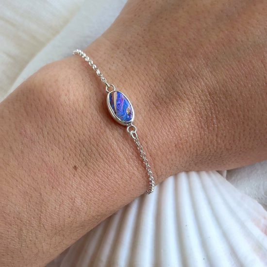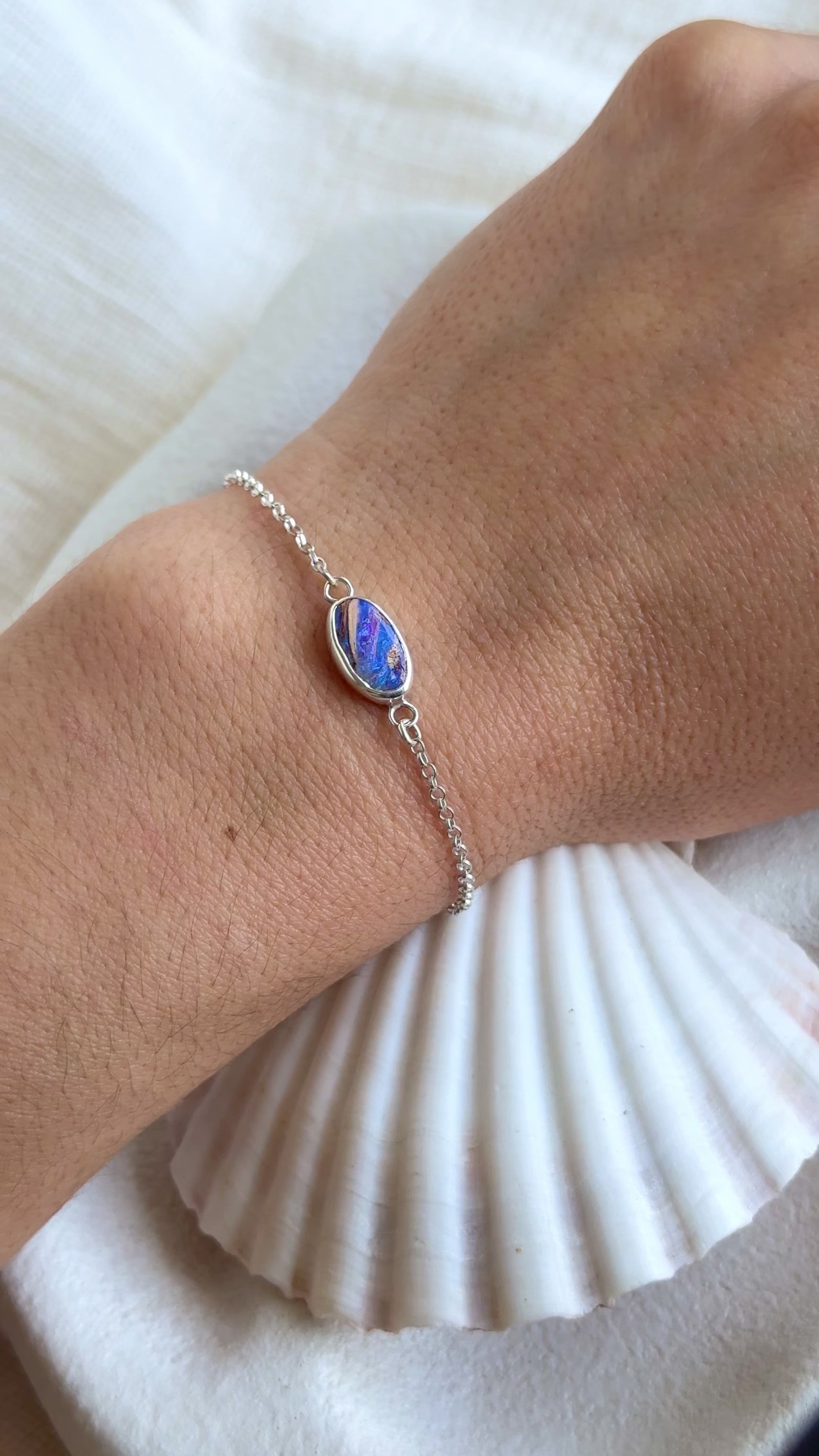 This delicate chain bracelet features a genuine Solid Australian opal, hand-set in solid 925 sterling silver. The oval-shaped opal displays striking flashes of blue and purple, echoing the colours of the ocean. Lightweight and comfortable, it’s designed for everyday wear — perfect on its own or layered with other favourites.