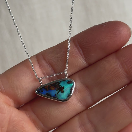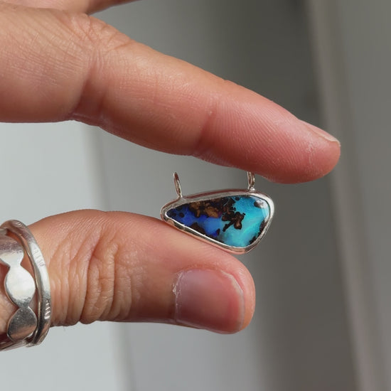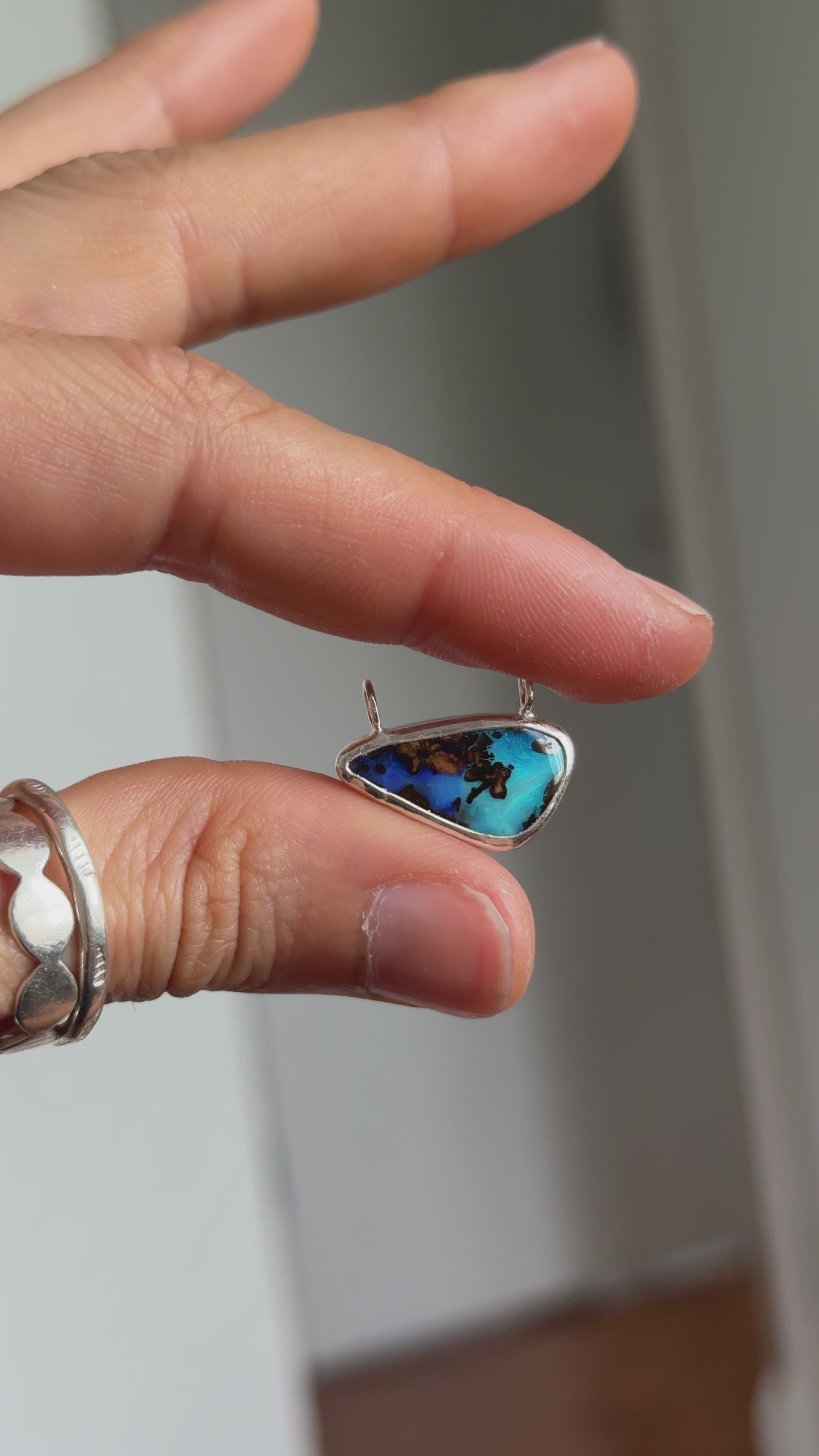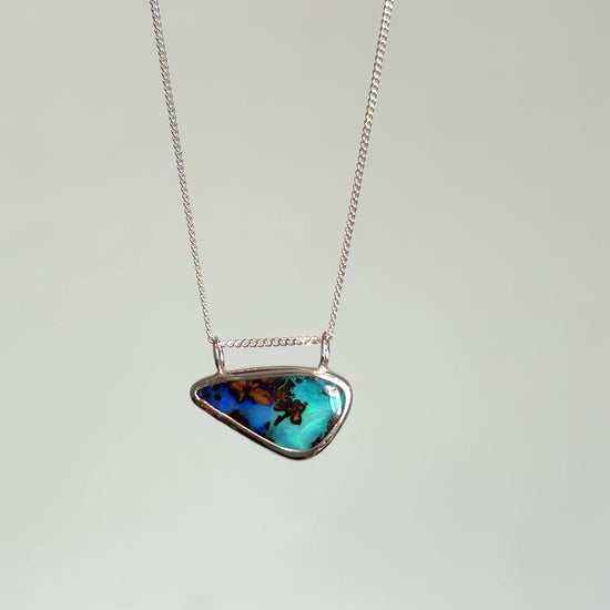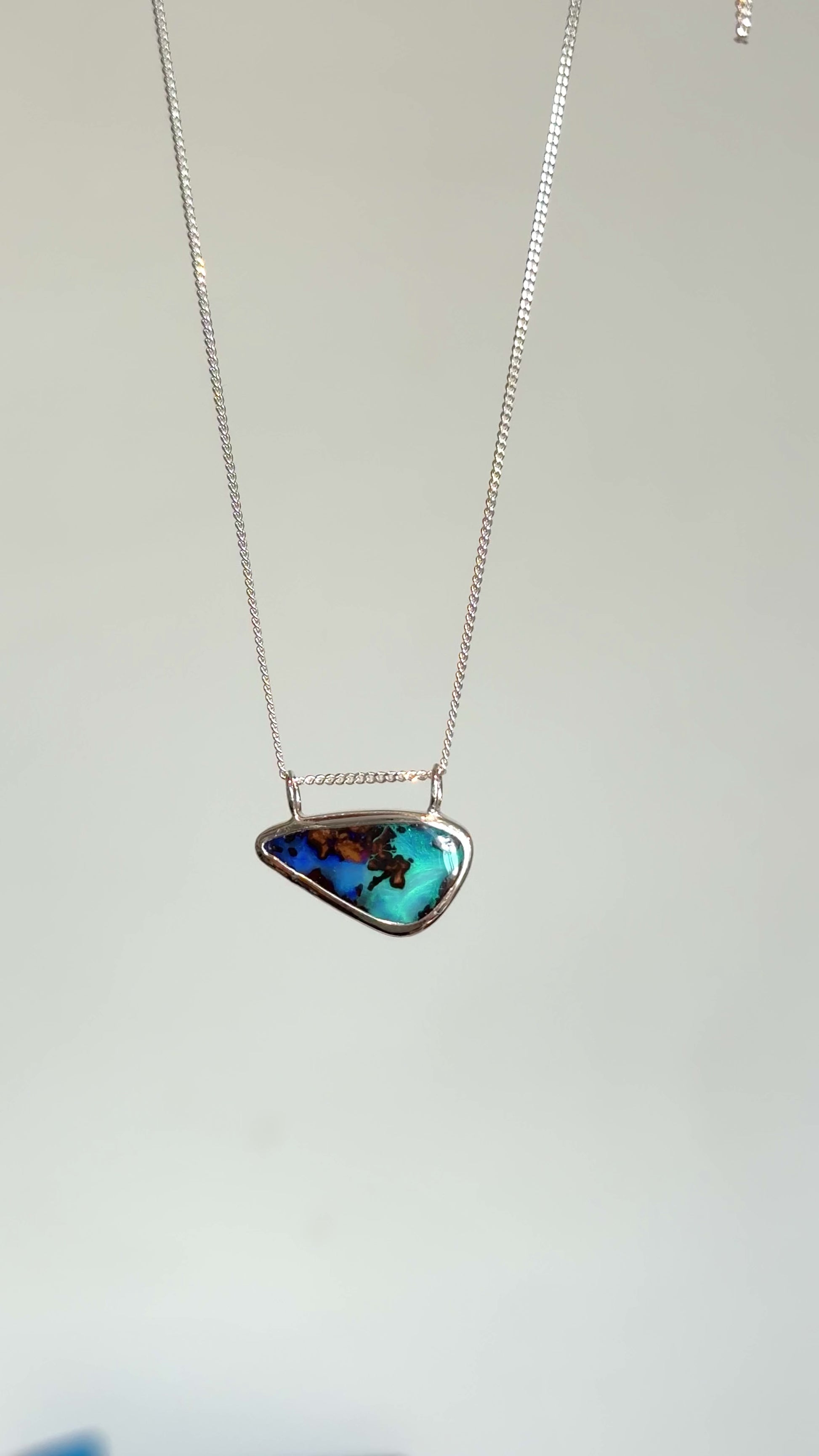From the Blue Echo collection, the Teal Solid Boulder Necklace captures the balance between ocean depth and earthy warmth. The boulder opal features striking blue and turquoise tones intertwined with natural brown patterns, a small landscape that feels both raw and fluid.