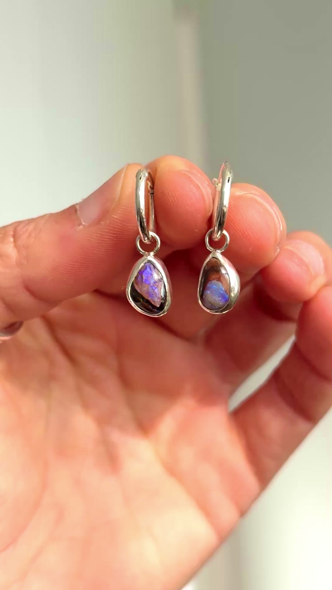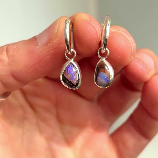 The Ocean Ember Opal Hoops are handcrafted in sterling silver, featuring natural Australian Boulder opals with deep earthy tones and vibrant flashes of purple and blue. Each stone is unique, with organic patterns that capture both the warmth of the earth and the shimmer of the sea. Lightweight and versatile, these opal hoop earrings are designed for everyday wear while adding a touch of natural elegance.